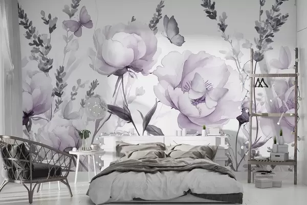 Stenske poslikave Cvetlični travnik, pivonije, sivka, metulji, akvarelni slog, barve zenice Št. w03668v3