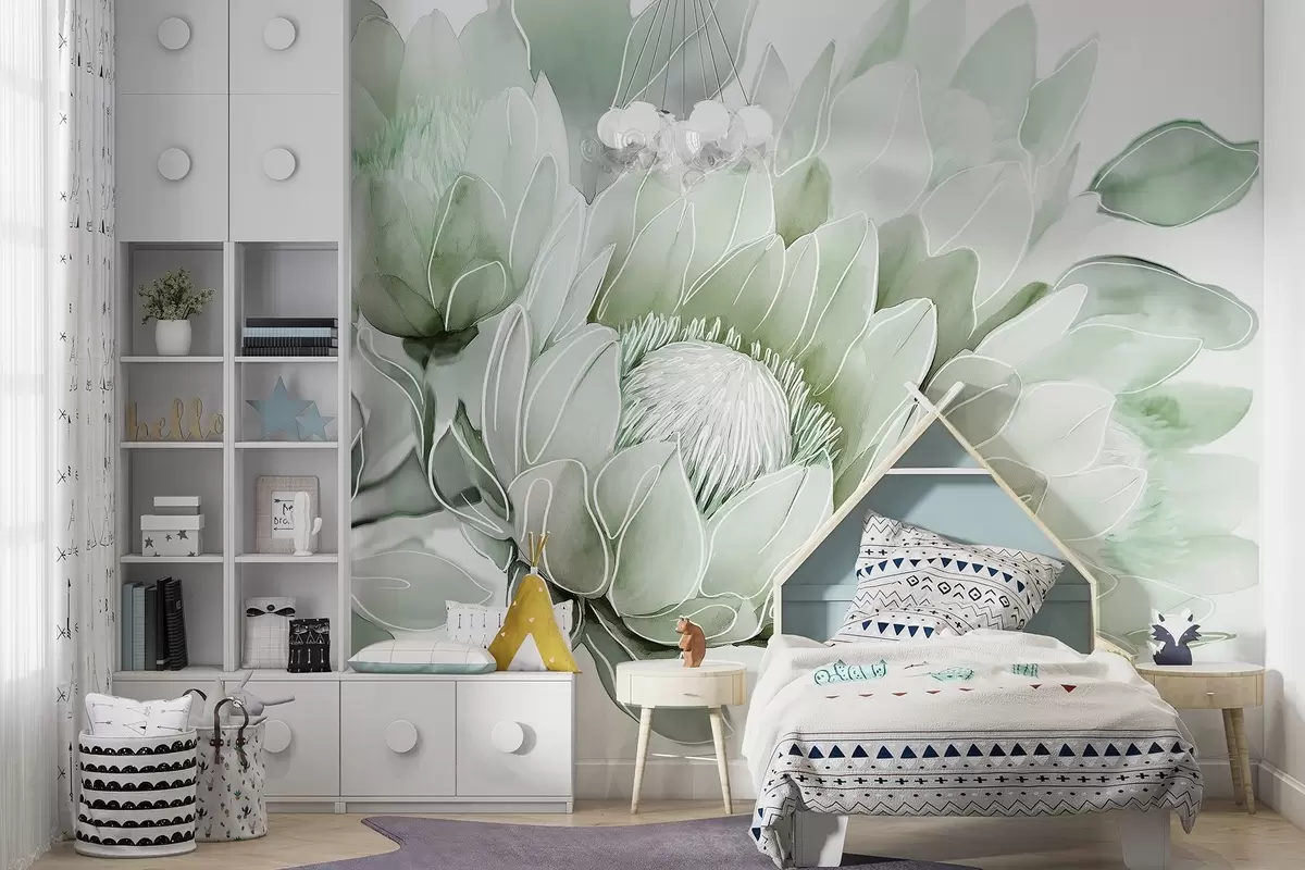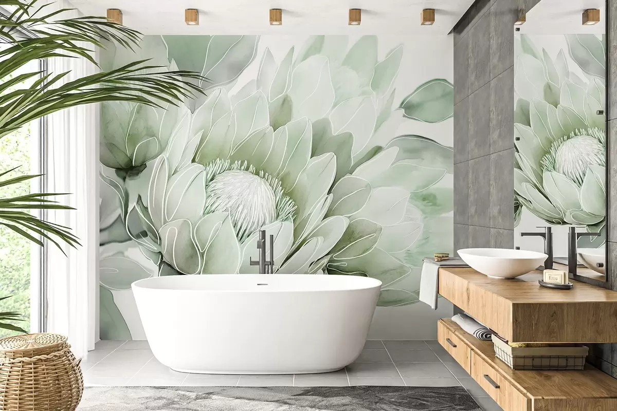 Stenske poslikave Lepi cvetovi protea, črta art risba, tropska, zelene barve Št. w03669v2