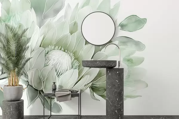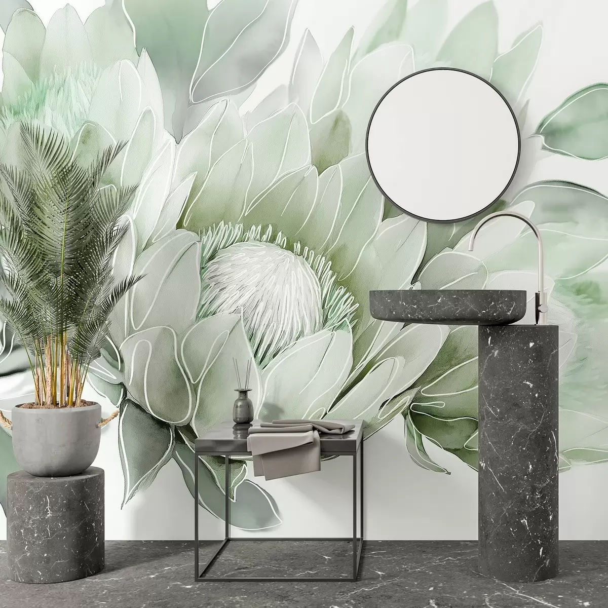 Stenske poslikave Lepi cvetovi protea, črta art risba, tropska, zelene barve Št. w03669v2