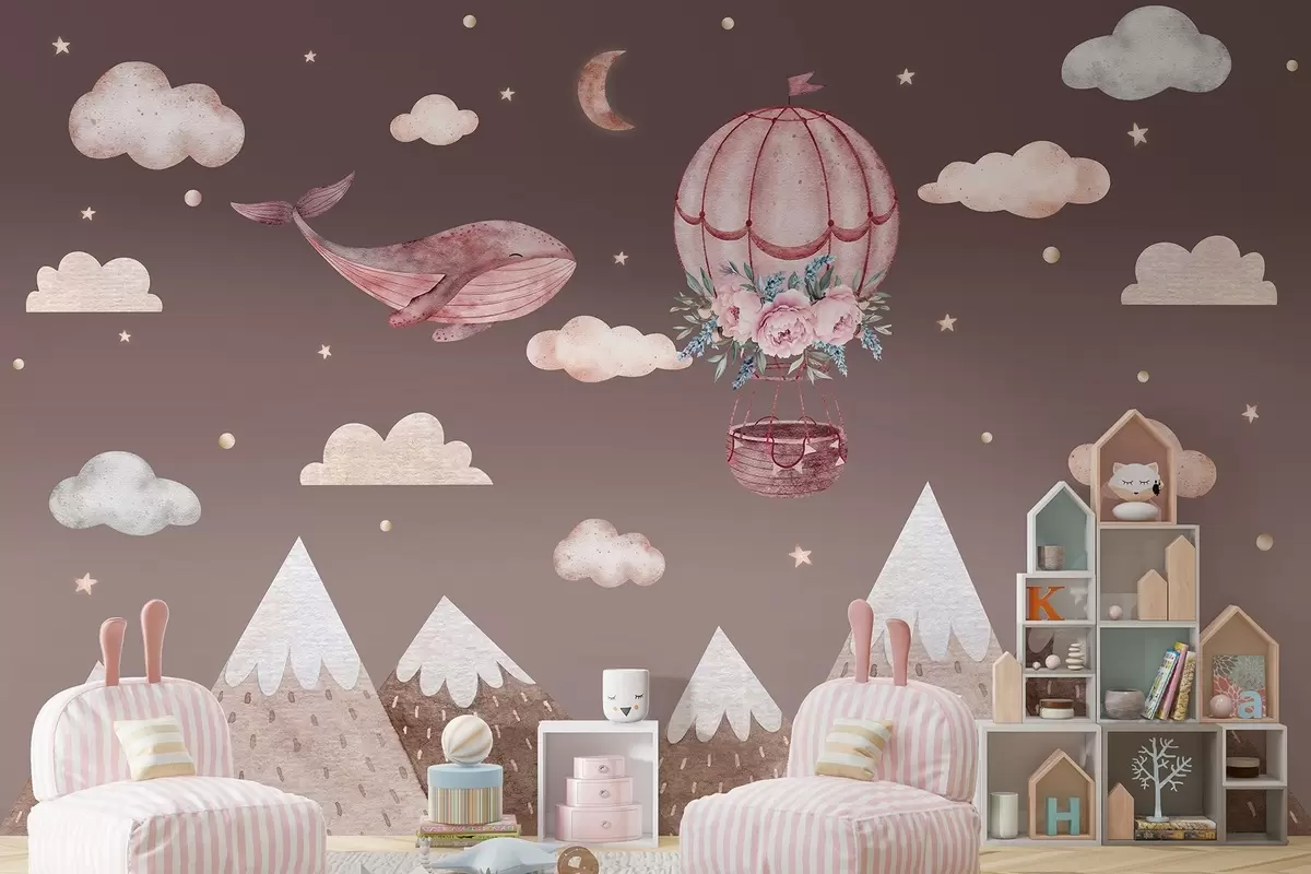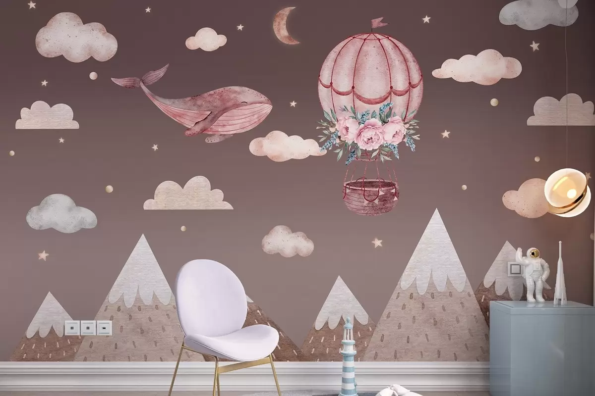 Stenske poslikave Srčkan kit z zračnim balonom, temno nebo z oblaki, gore, akvarel, rožnate barve Št. w03673v1