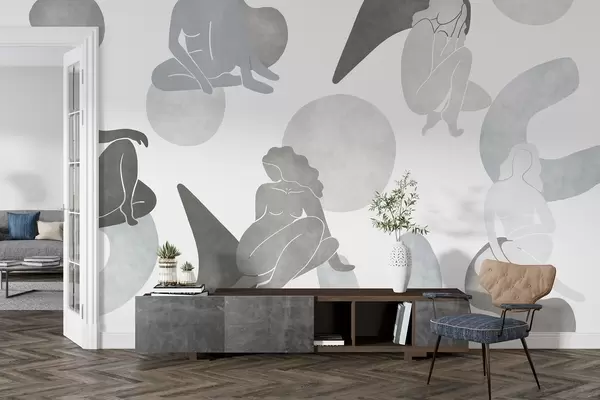 Stenske poslikave Geometrijske abstrakcije z ženskimi silhuetami, boho slog, sive barve Št. w03753v5