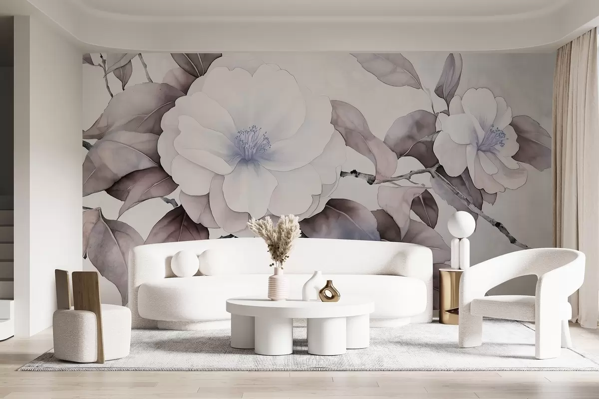 Stenske poslikave Cvetovi kamelije v akvarelnem slogu na veji, vijolične barve Št. w03761v1