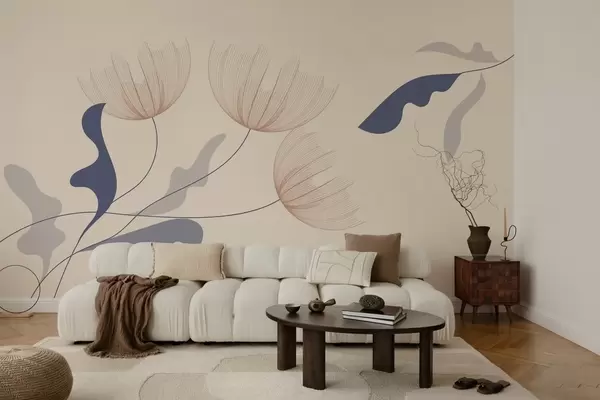 Stenske poslikave elegantno minimalistično cvetje v modrih tonih na bež ozadju Št. w03763