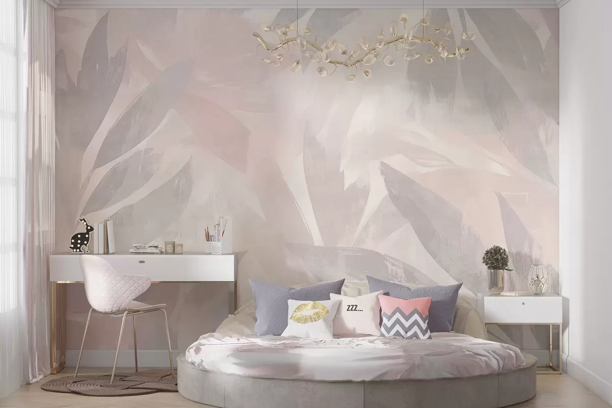 Stenske poslikave Tropski listi, cvetlični, palme, pastelni slog, roza in bež barve Št. w03881