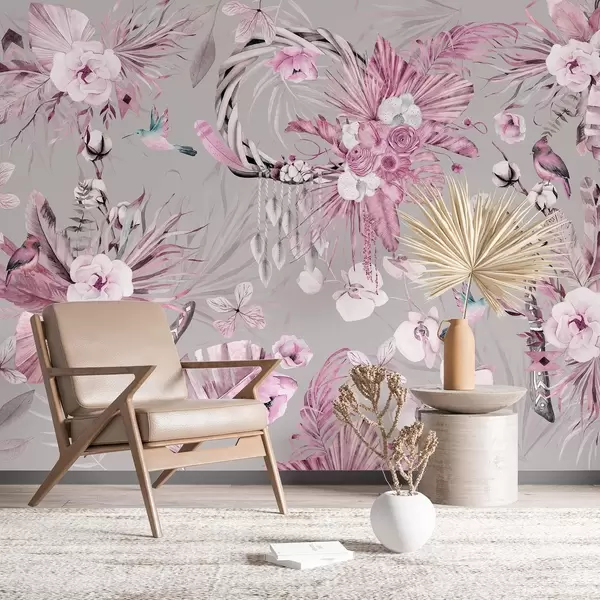 Stenske poslikave Okrasek v boho slogu s cvetovi pivonik in pticami, akvarelni slog, rožnate barve Št. w03885v1