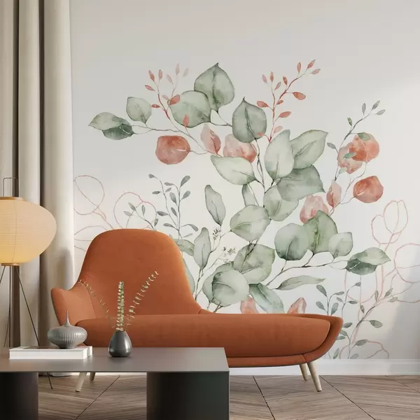 Stenske poslikave Rastlinstvo in veje, imitacija teksturiranega akvarela, odtenki zelene in rdeče barve Št. w03927v1