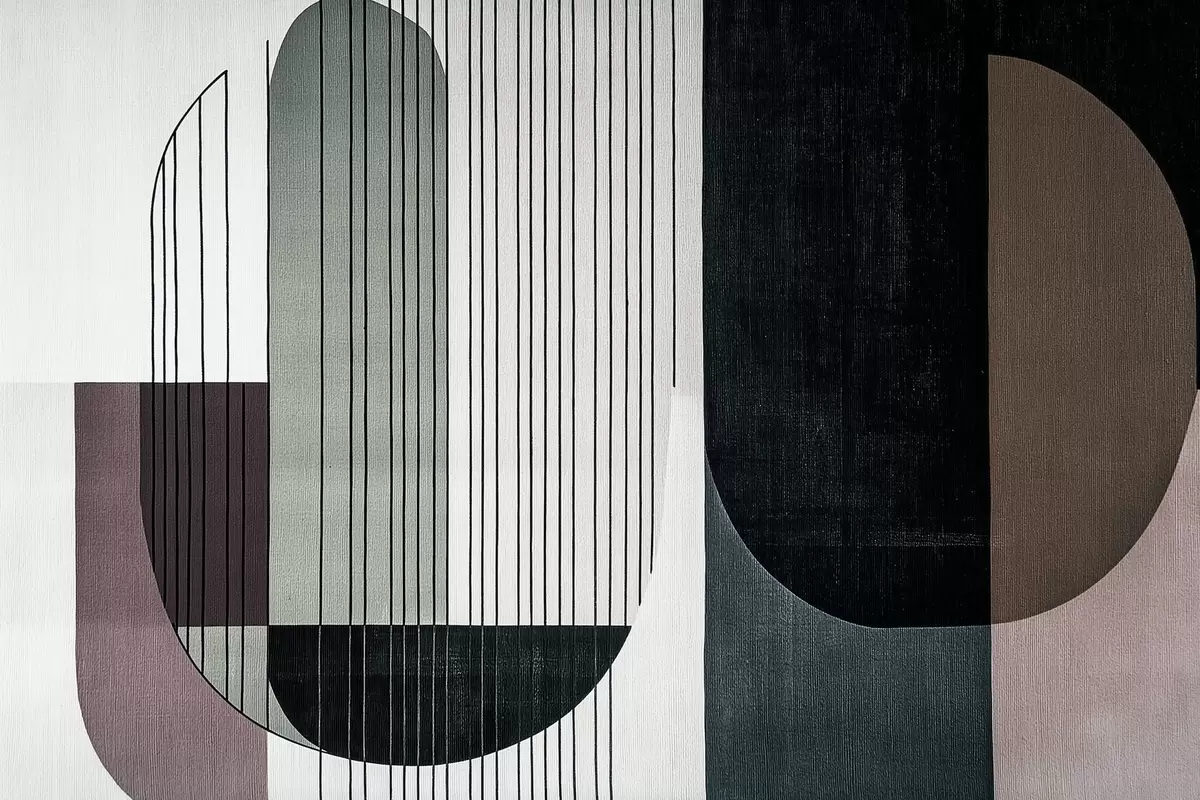Stenske poslikave sodobna abstraktna geometrijska kompozicija s prekrivajočimi se oblikami in vzorci navpičnih črt, tanke črte, ki zapolnjujejo trapezoide in ovale, mehka tekstilna tekstura, topli utišani toni, kot so olivno zelena, taupe, bež in oglje, subtilni učinki prosojnosti med oblikami Št. w03937v1