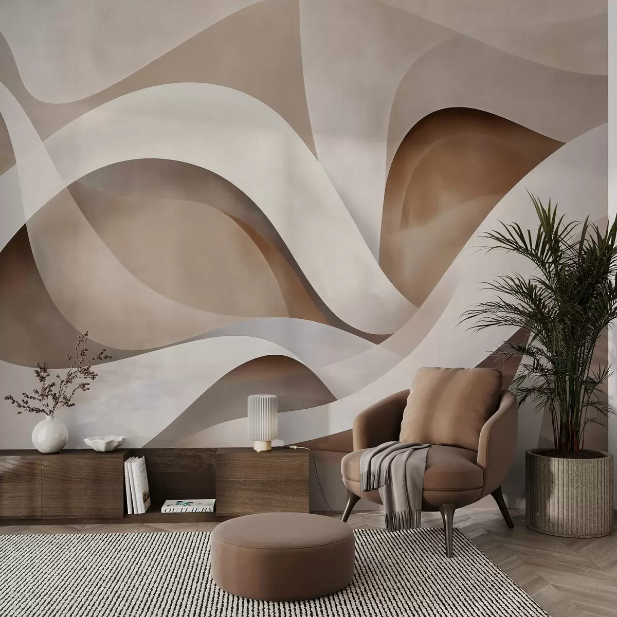 Stenske poslikave abstraktna minimalistična kompozicija večplastnih organskih oblik, od katerih je vsaka začrtana z mehkim belim robom, napolnjena z gostimi notranjimi linearnimi potezami, podobnimi teksturi tkanine ali papirja, tekočimi krivuljami v nevtralnih tonih bež, peska, kamna in slonovine, reliefnega videza Št. w03940v1
