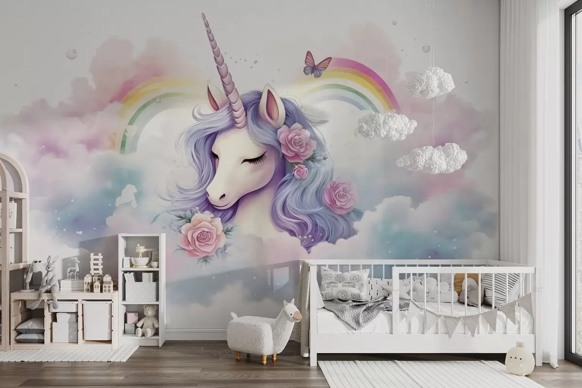 Stenske poslikave Pastelni enorog v oblakih z mavrico in vrtnicami Št. w03990