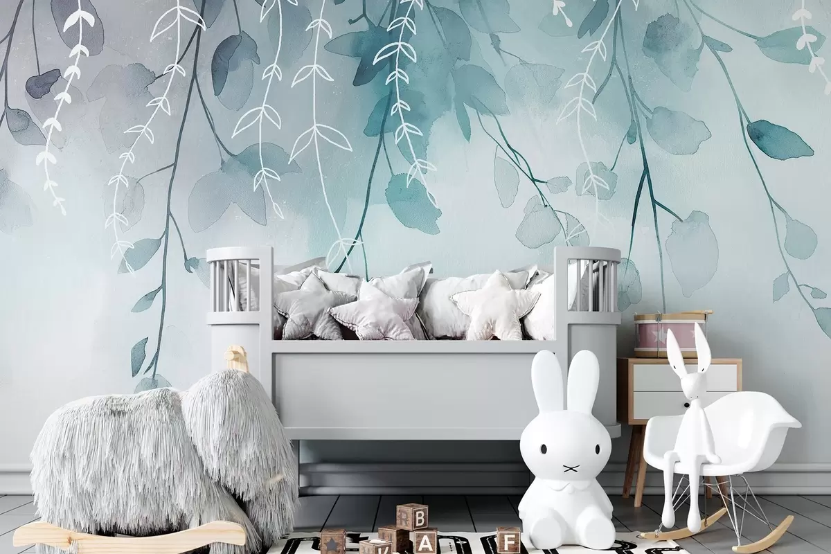 Stenske poslikave Veje z listi v akvarelnem slogu, naravne akvamarinske barve Št. w04007v3