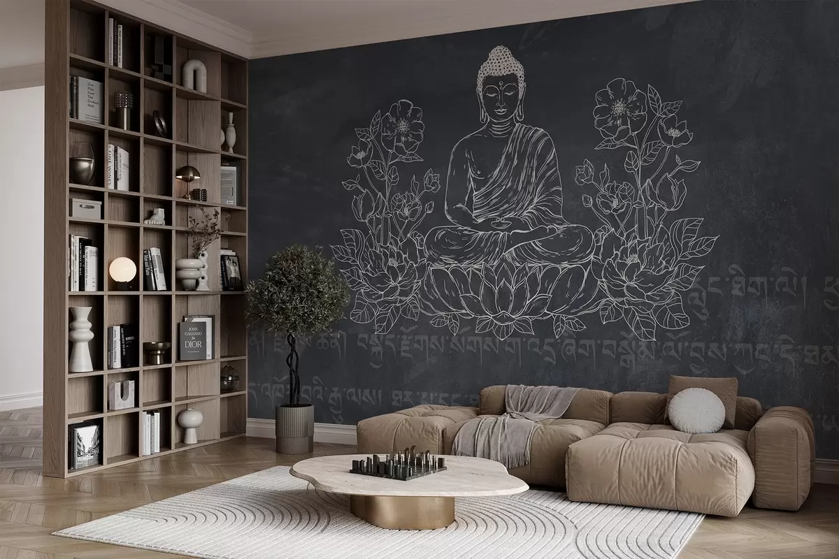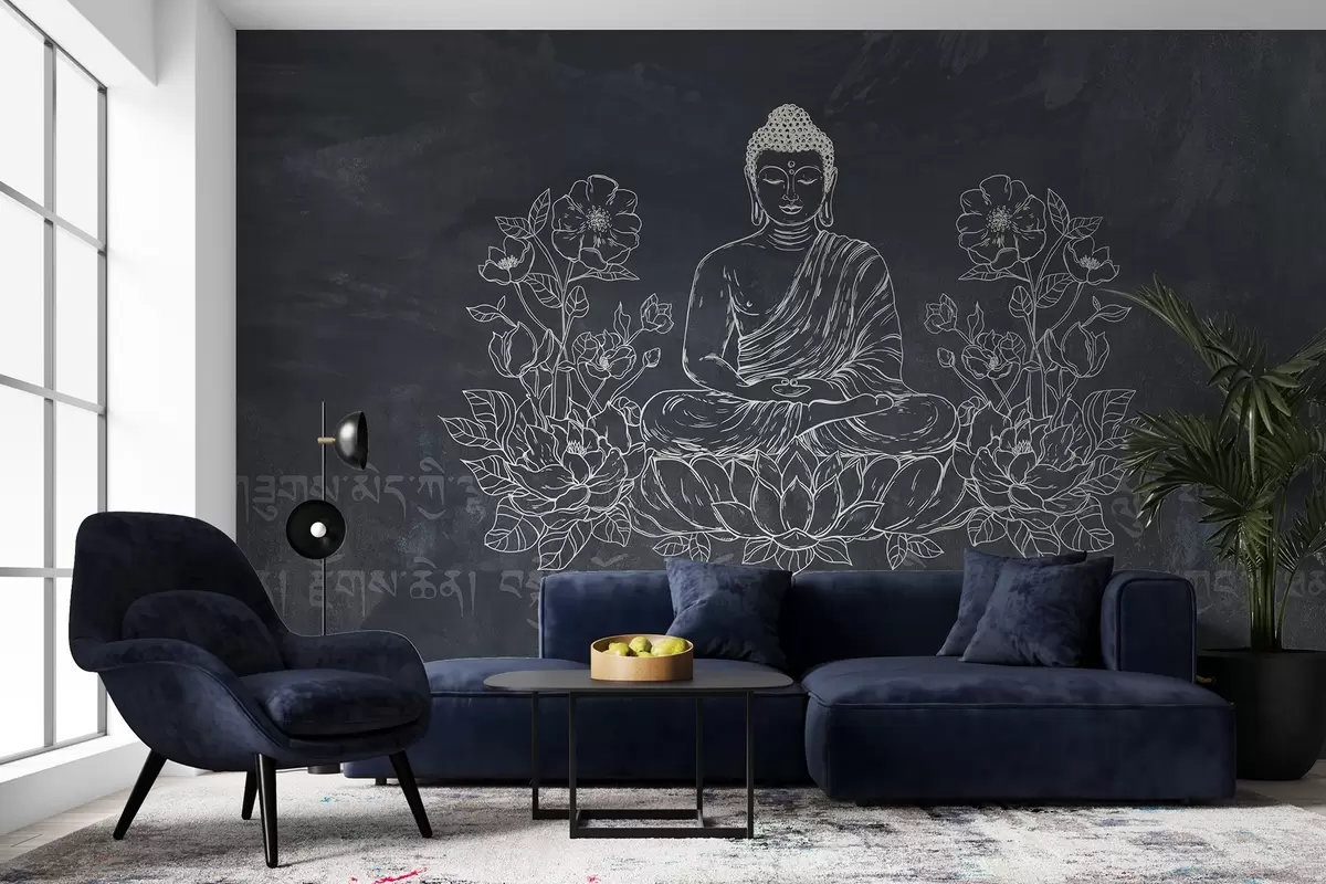 Stenske poslikave Meditiranje Bude z lotosovimi cvetovi, črtasta umetnost, orientalska, temno ozadje Št. w04008