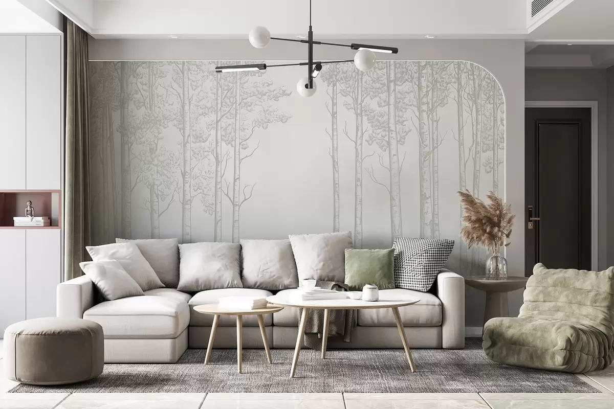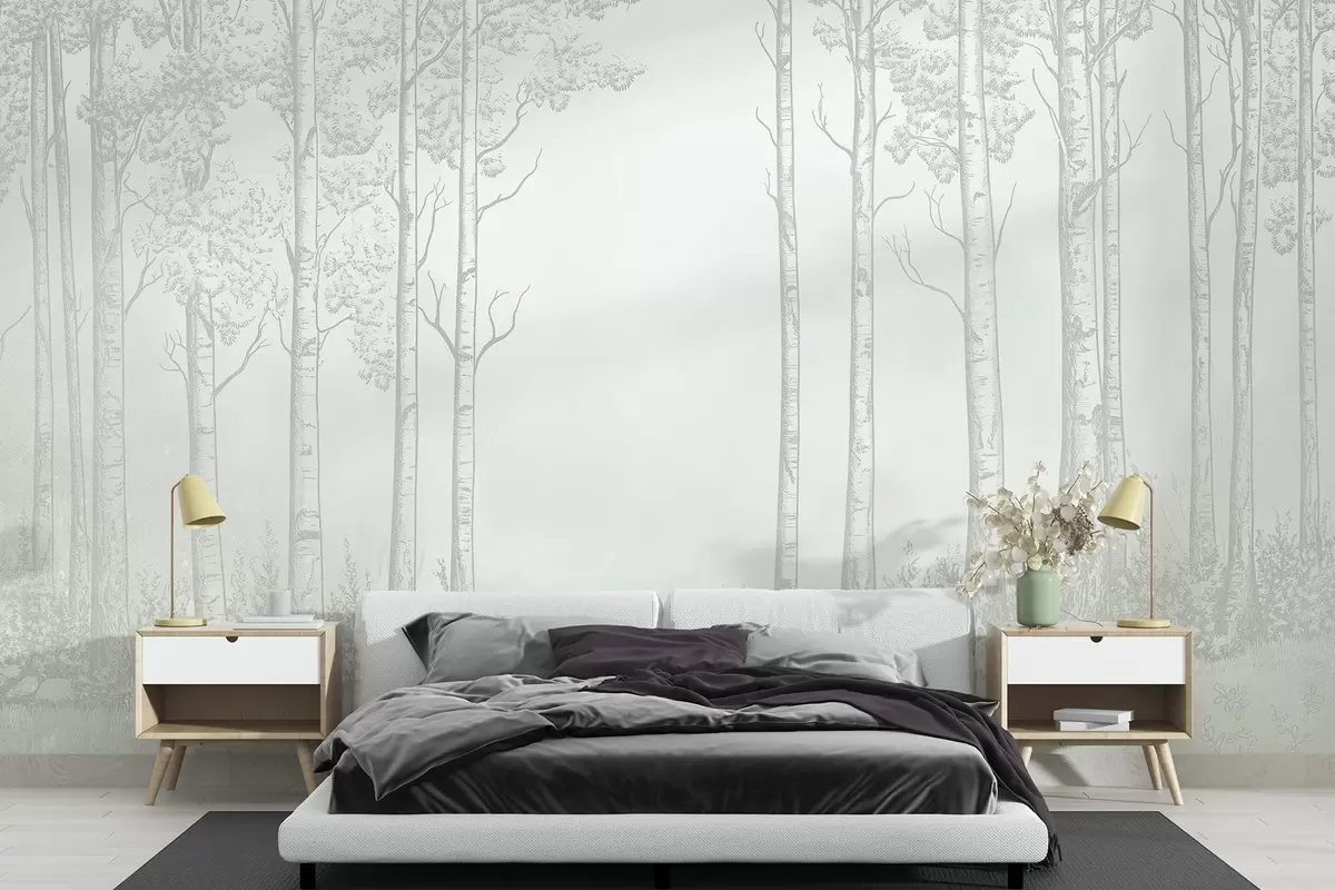 Stenske poslikave Gozd z brezami, minimalizem, narava, zelena barvna paleta Št. w04009v1