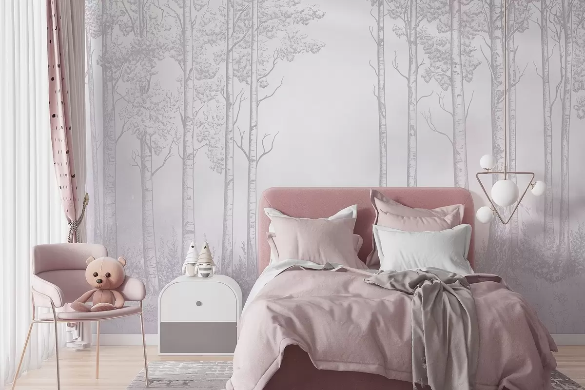 Stenske poslikave Gozd z brezami, minimalizem, narava, rožnata barvna paleta Št. w04009v2