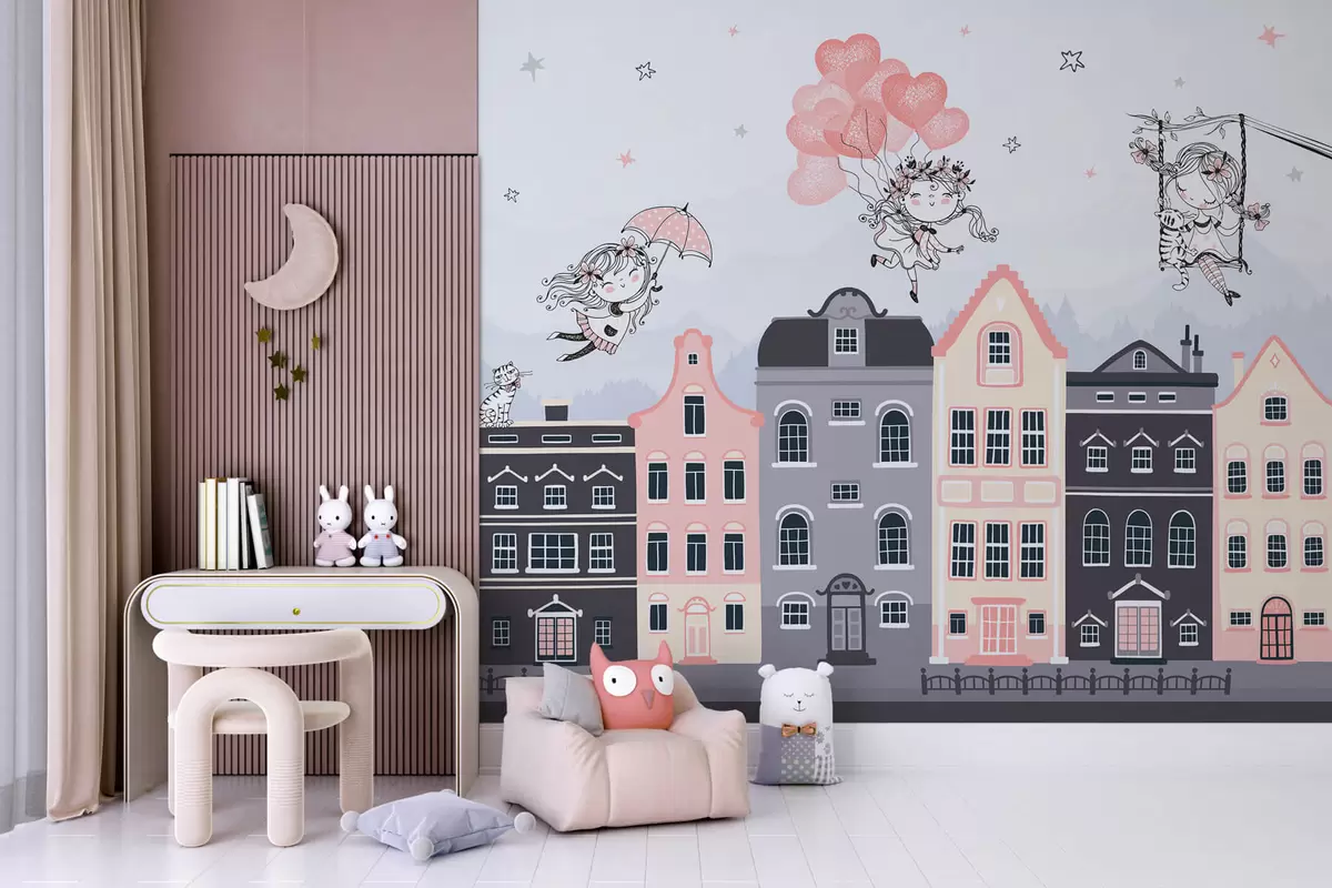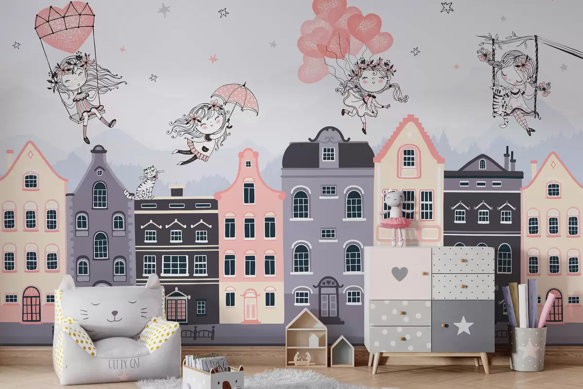 Stenske poslikave Mestna pokrajina s srčkanimi dekleti Št. w04014