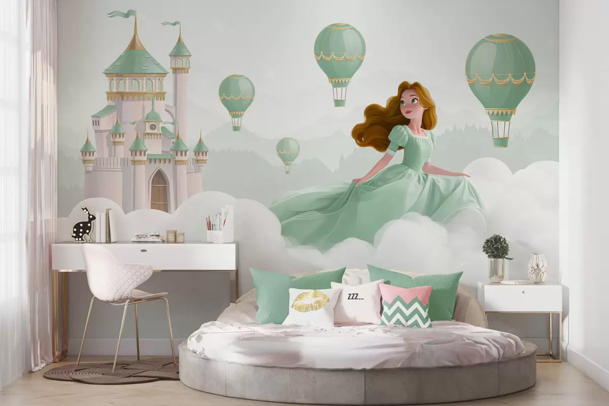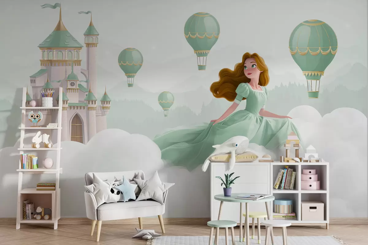 Stenske poslikave Princesa med oblaki v ozadju pokrajine z gradom Št. w04015v2