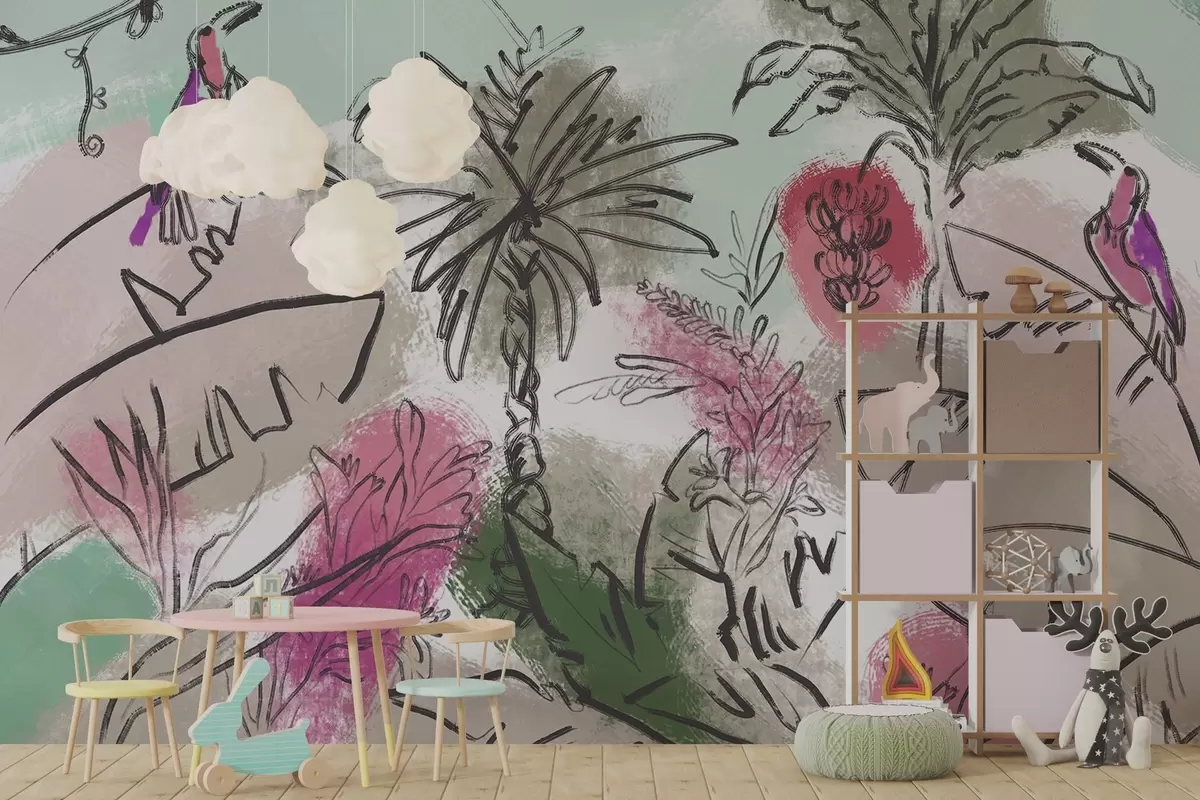 Stenske poslikave Tropski tisk z rožnatimi cvetovi, eksotičnimi papagaji Št. w04019v1