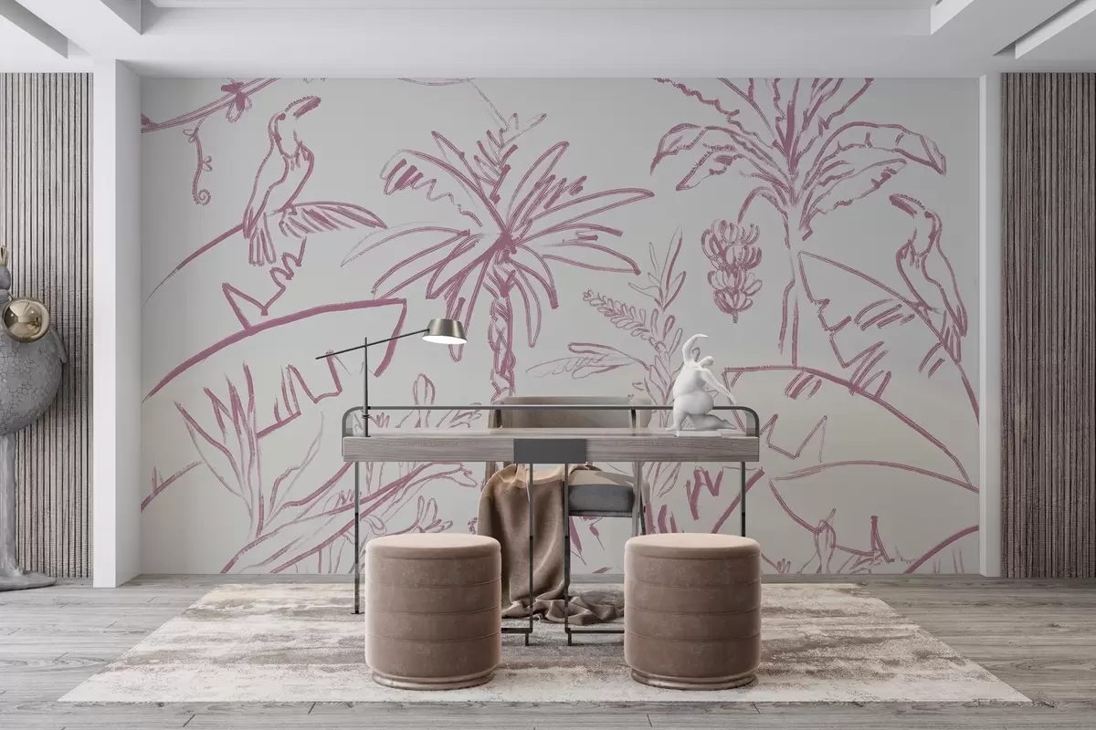 Stenske poslikave Tropske črte v roza barvi, tropske rastline, banane Št. w04020v2