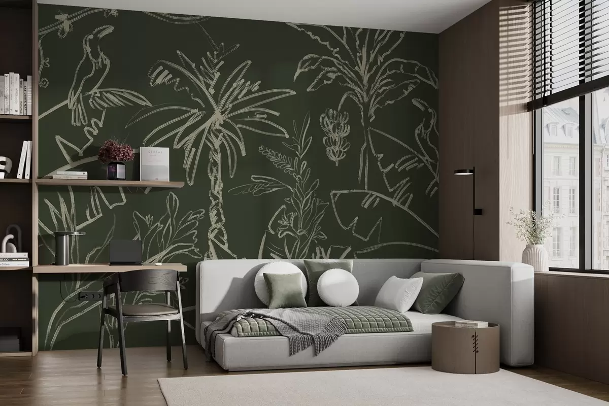 Stenske poslikave Tropski vzorec na temno zelenem ozadju, palme, banane Št. w04020v5