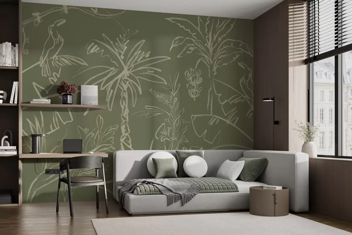 Stenske poslikave Tropski vzorec na zelenem ozadju, palme, banane Št. w04020v6