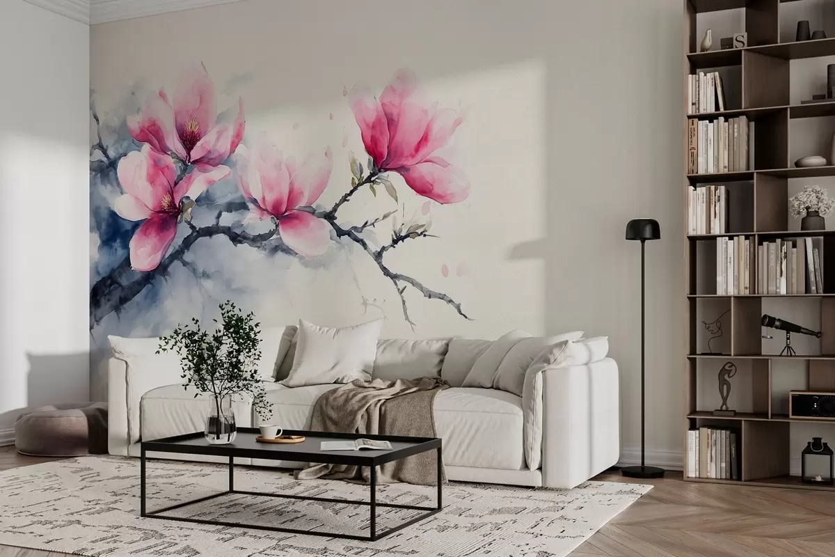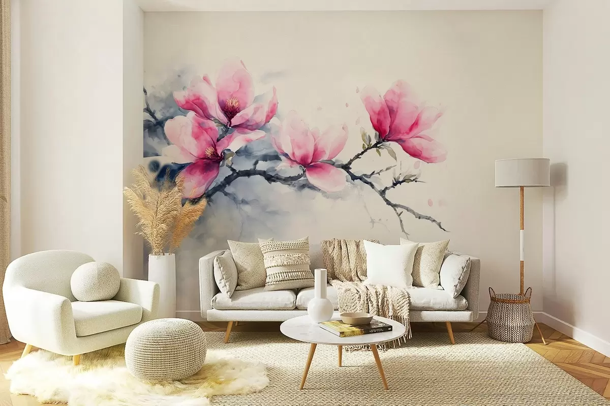 Stenske poslikave cvetoča veja rožnate magnolije na ozadju slonovine Št. w04027