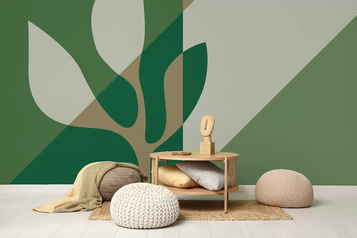 Stenske poslikave abstraktna grafična rastlina na ozadju geometrije v zelenih in oker barvah Št. w04028