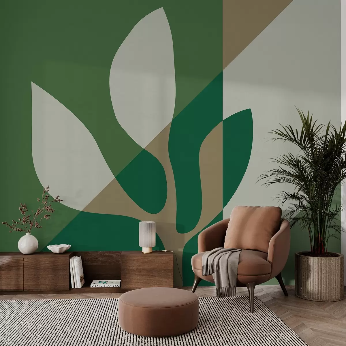 Stenske poslikave abstraktna grafična rastlina na ozadju geometrije v zelenih in oker barvah Št. w04028