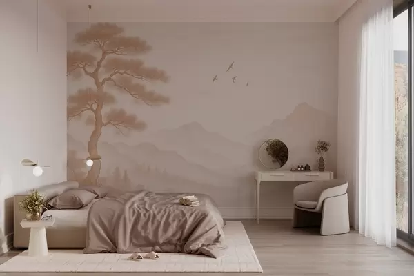 Stenske poslikave panorama gričev z velikim drevesom v odtenkih moka Št. w04033v1