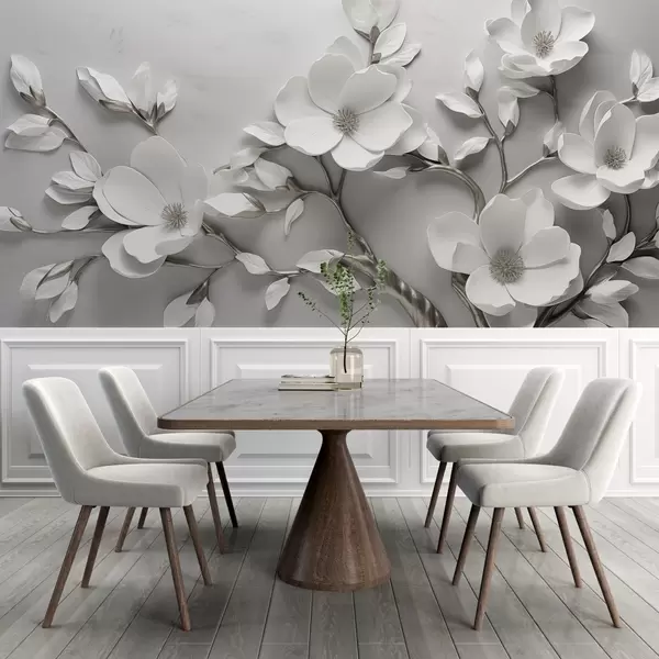 Stenske poslikave Dimenzionalna cvetlična veja v čisti beli barvi in nevtralnih tonih Št. w04039v2