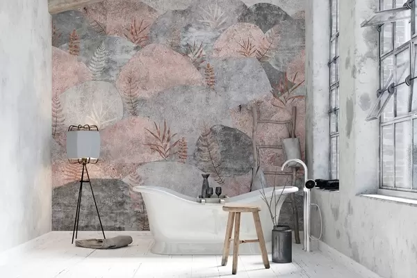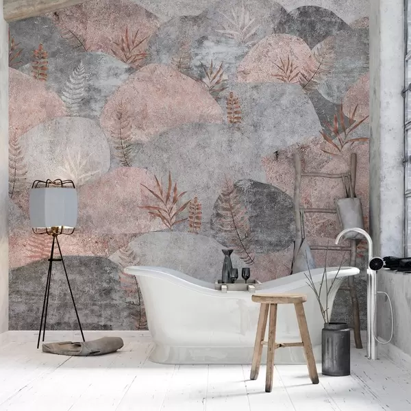 Stenske poslikave Kamni z rastlinami, praproti, nordijski, rustikalni slog, sive in rožnate barve Št. w04064v1