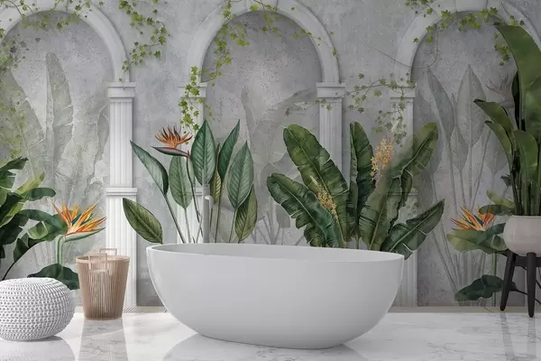Stenske poslikave Betonska stena z loki in tropskimi rastlinami, cvetličnimi, naravnimi barvami Št. w04065