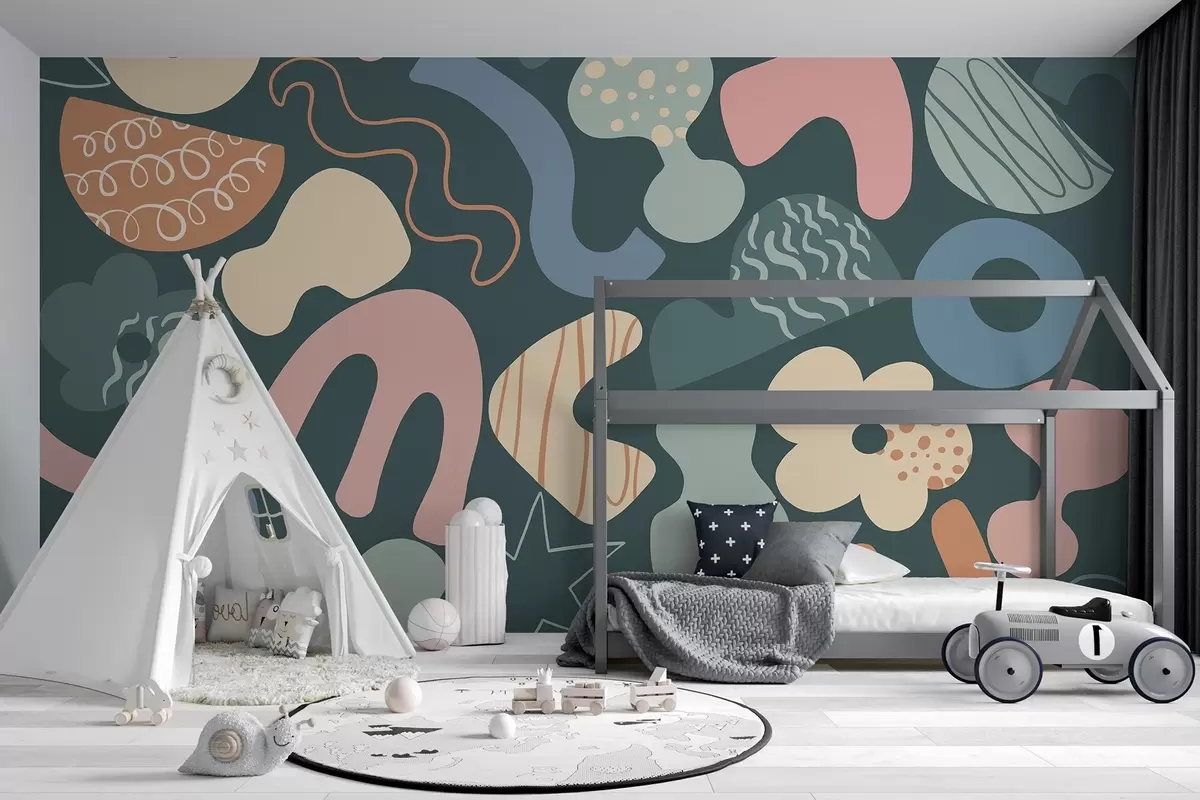 Stenske poslikave Geometrijske figure z risbo, mladostnik, temno zeleno ozadje Št. w04068v3