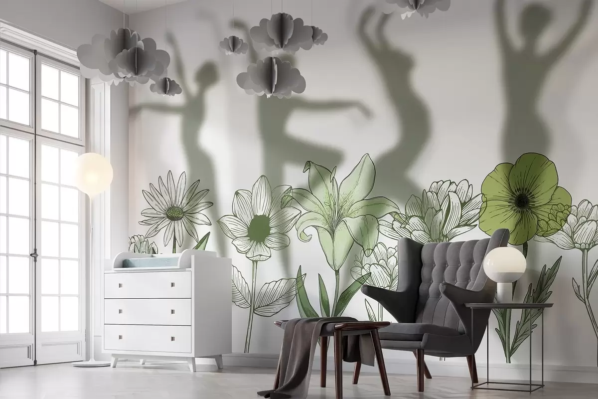 Stenske poslikave Balerine silhuete, kmečko cvetje, črtasta umetnost, zelene barve Št. w04069v1