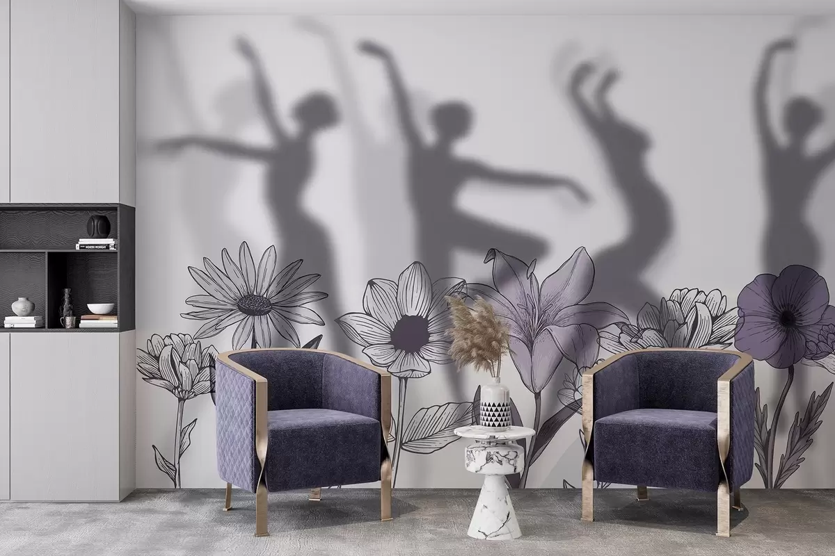 Stenske poslikave Balerine silhuete, rustikalne rože, črtna umetnost, sive in vijolične barve Št. w04069v2