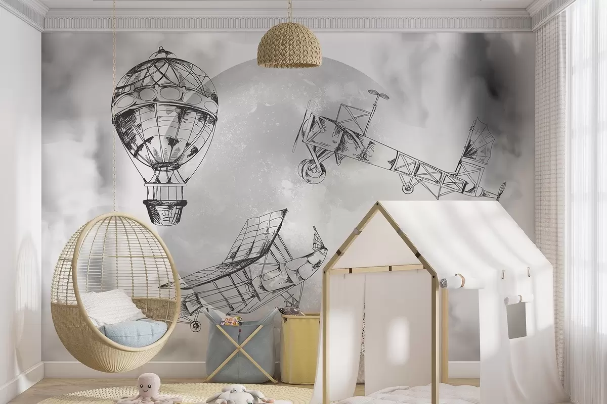 Stenske poslikave Retro letala na ozadju lune in oblakov Št. w04085