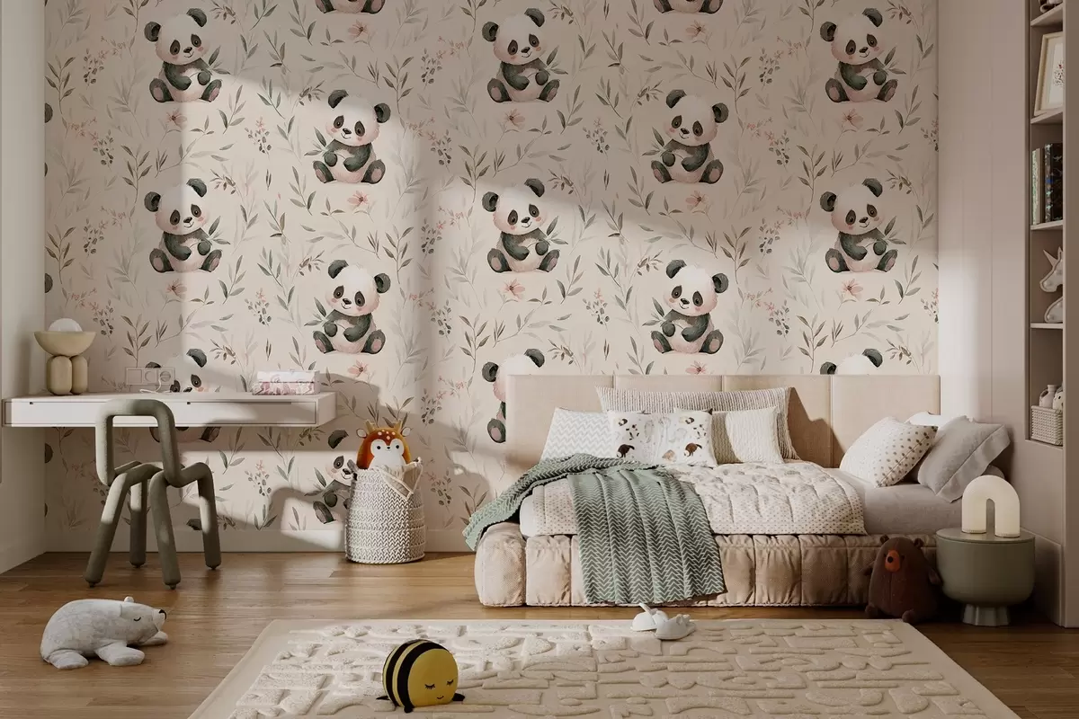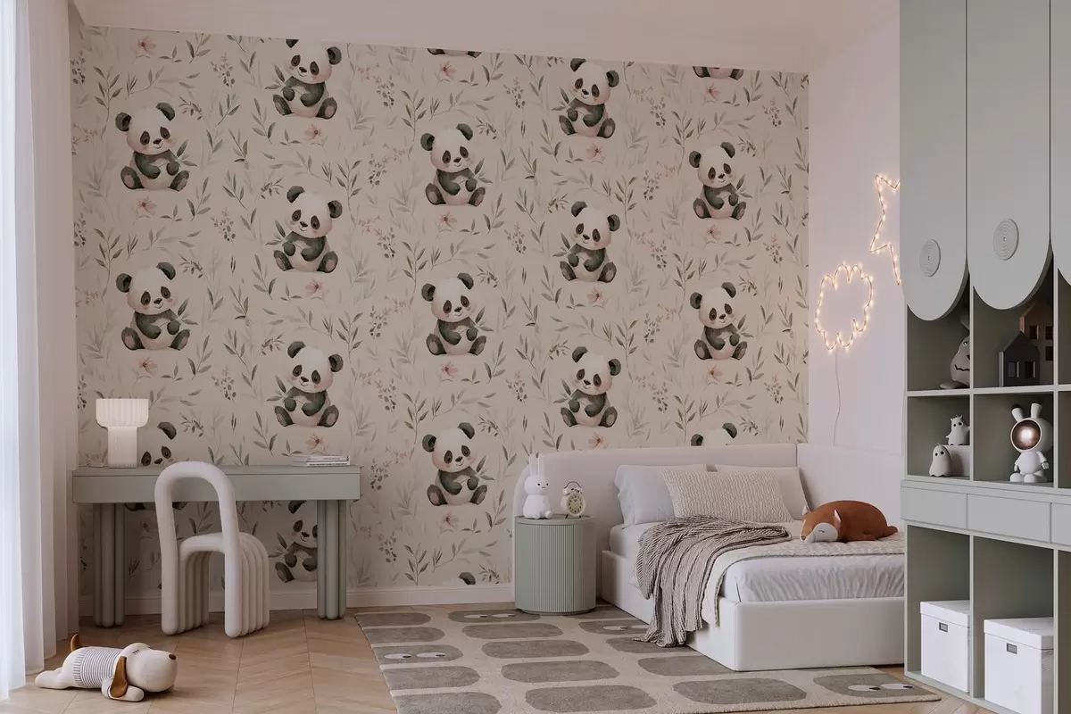 Stenske poslikave srčkane pande v stilu dojenčka med rastlinami Št. w04170