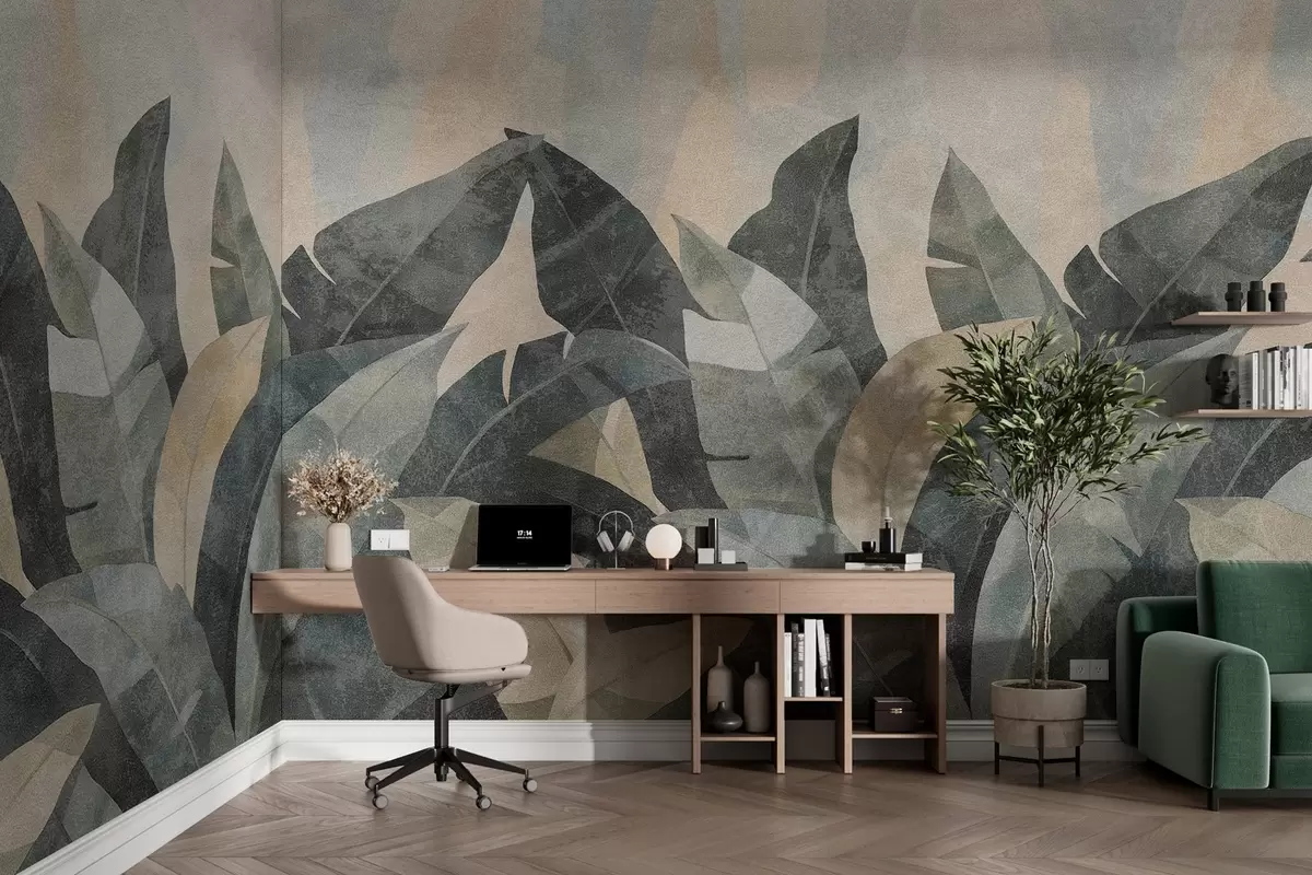 Stenske poslikave teksturirani listi banan v naravnih odtenkih bež, zelene in sive barve Št. w04285