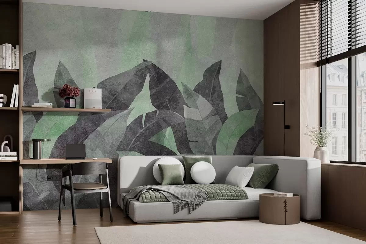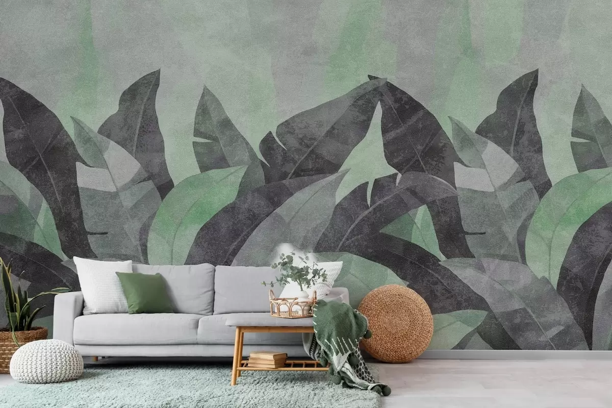 Stenske poslikave teksturirani listi banan v zelenih in sivih odtenkih Št. w04285v1