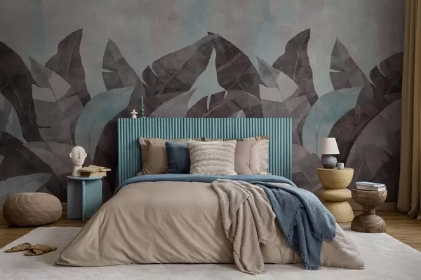 Stenske poslikave teksturirani listi banan v modrih in sivih odtenkih Št. w04285v2