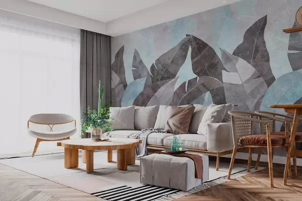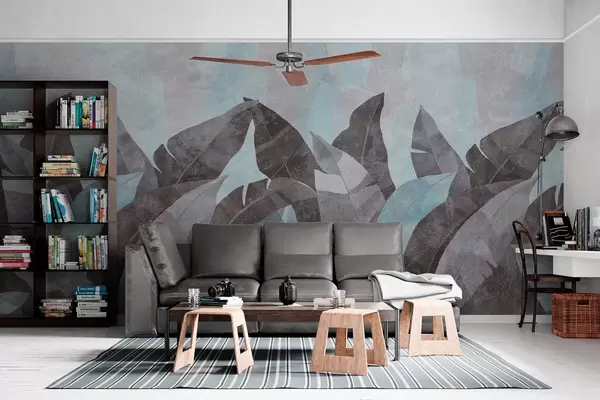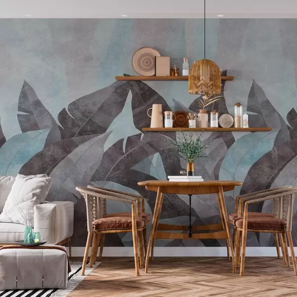 Stenske poslikave teksturirani listi banan v modrih in sivih odtenkih Št. w04285v2