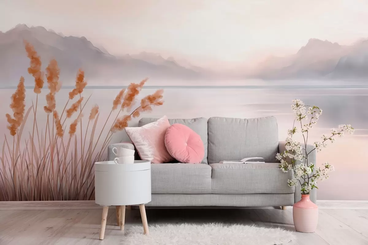 Stenske poslikave slikovito jezero s trstičjem in gorami Št. w04315