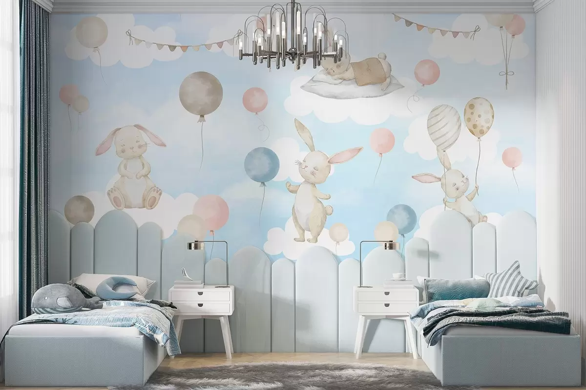 Stenske poslikave Zajci z baloni na oblakih Št. w04337