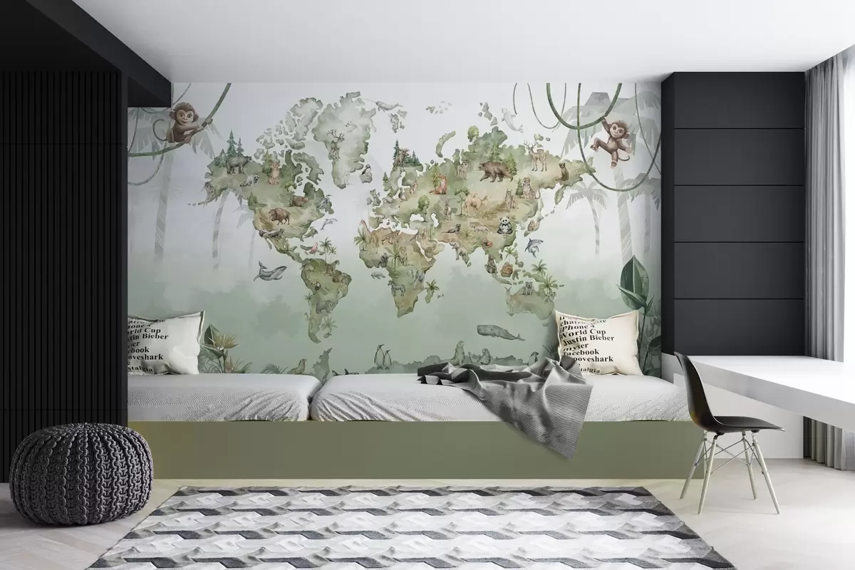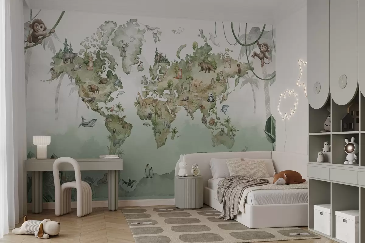 Stenske poslikave Zemljevid sveta z živalmi v akvarelnem slogu Št. w04418