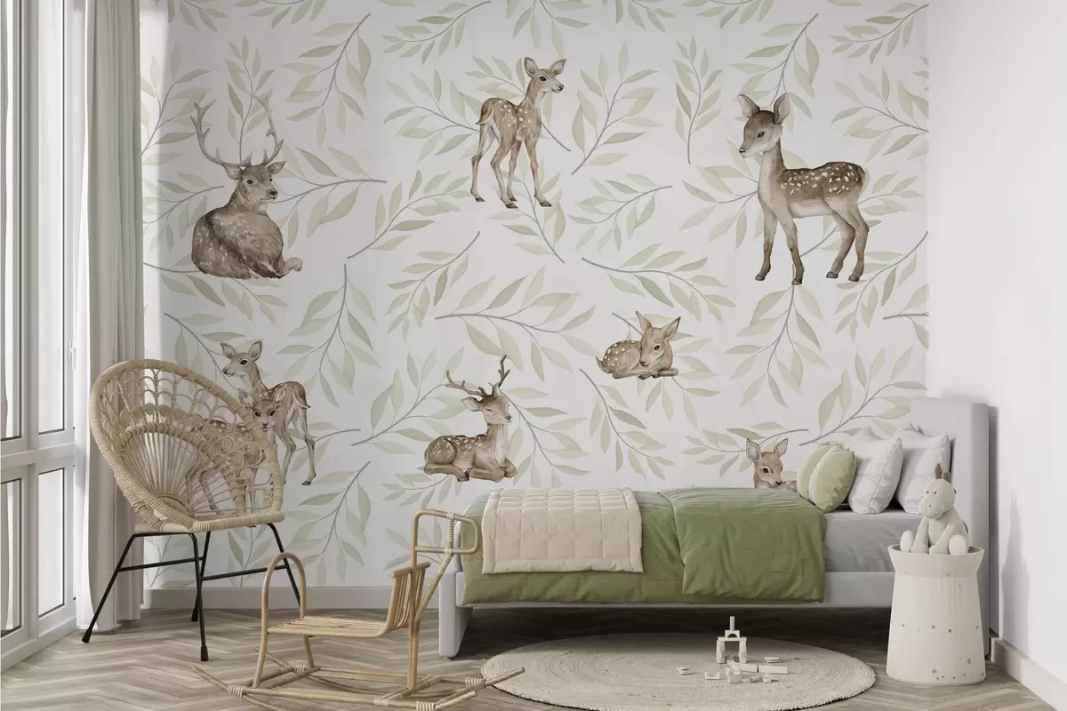 Stenske poslikave Jelenčki med zelenkastimi listi na belem ozadju Št. w04461v1