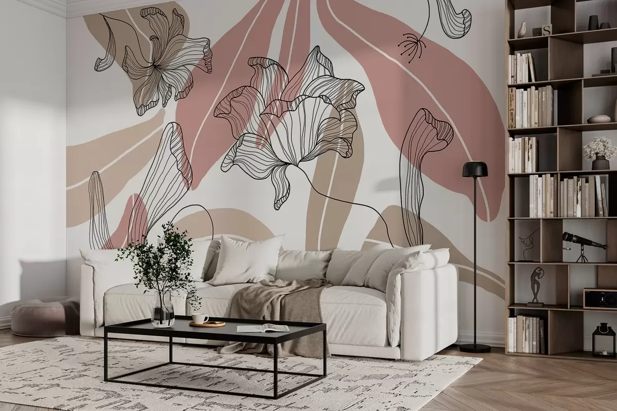 Stenske poslikave abstrakni listi in cvetovi v prašnih in bež barvah Št. w04499