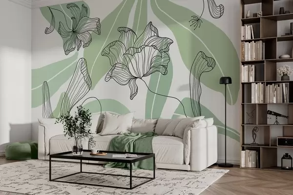 Stenske poslikave abstrakte liste in cvetje v zelenih odtenkih Št. w04499v1