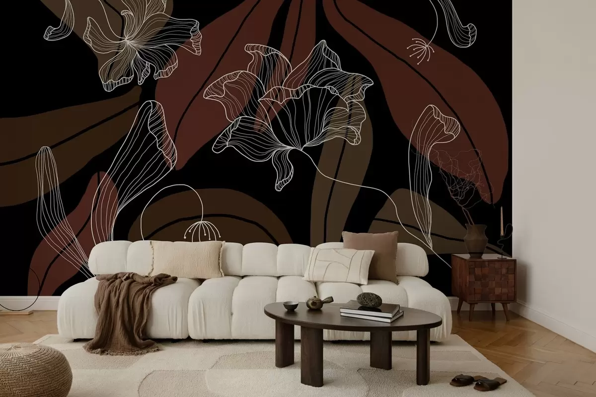 Stenske poslikave abstrakcijske liste in cvetje v prašnih in bež barvah na temnem ozadju Št. w04499v3