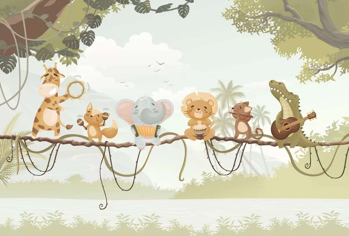 Stenske poslikave Živali z glasbenimi instrumenti pred tropskim ozadjem Št. w04505v1