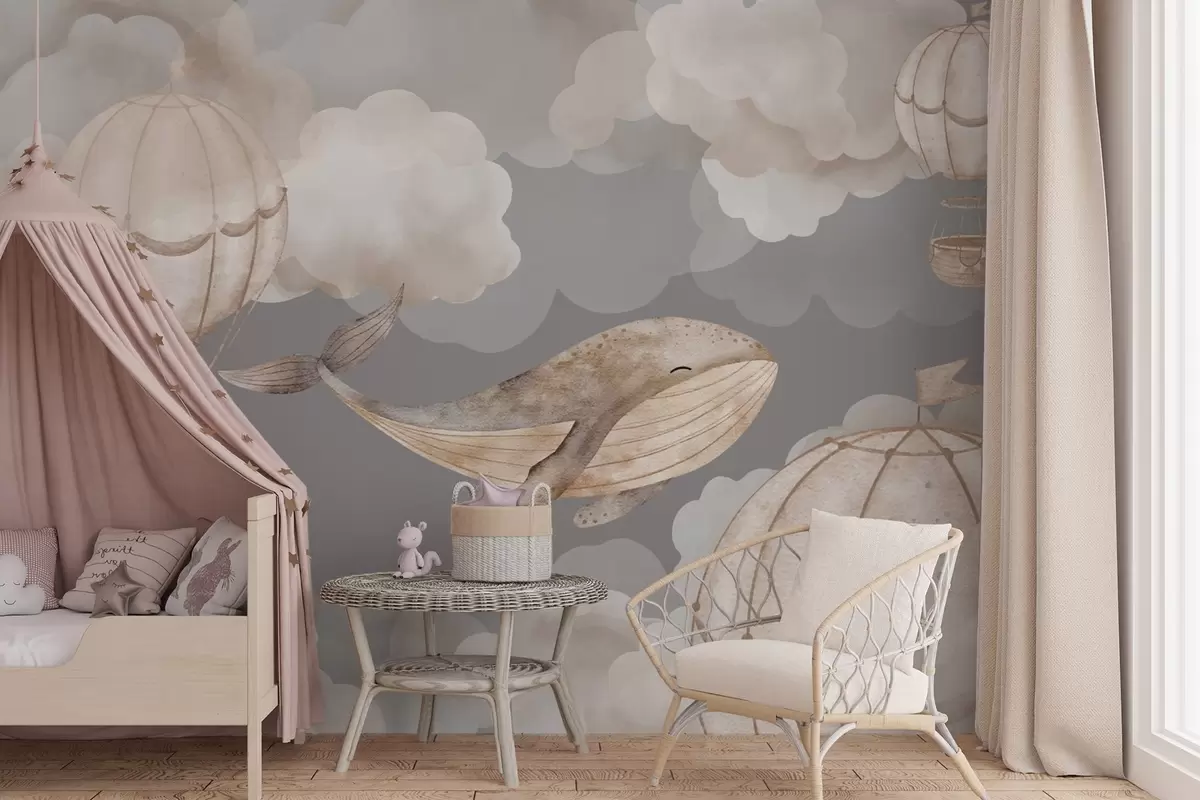 Stenske poslikave Kit in toplozračni baloni med mehkimi oblaki Št. w04522
