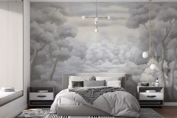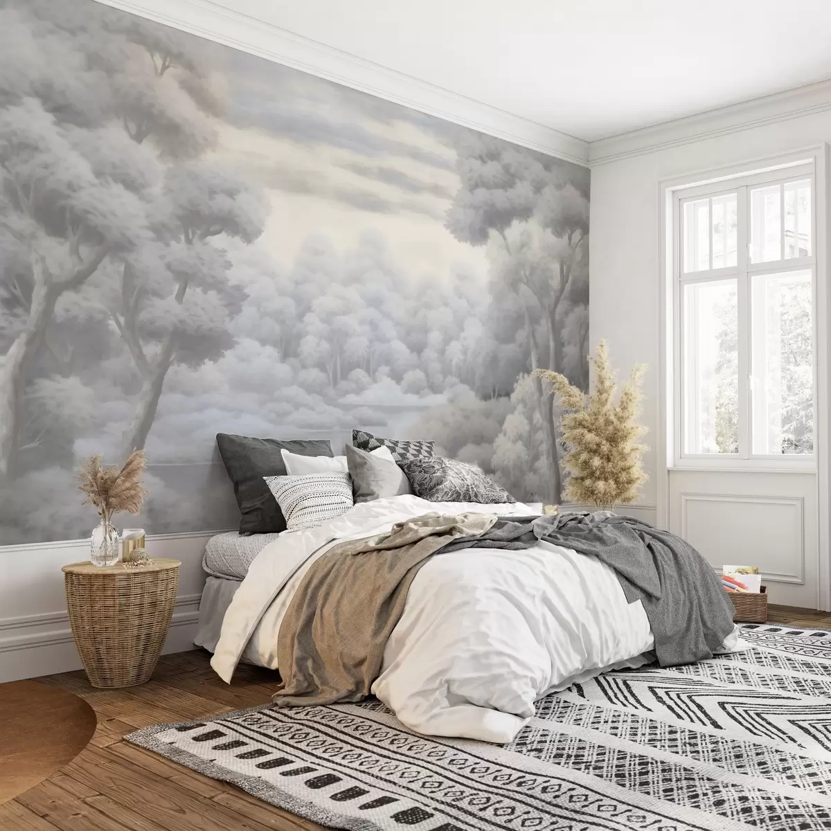 Stenske poslikave Megleni gozd in jezero v nežnih sivih odtenkih Št. w04617
