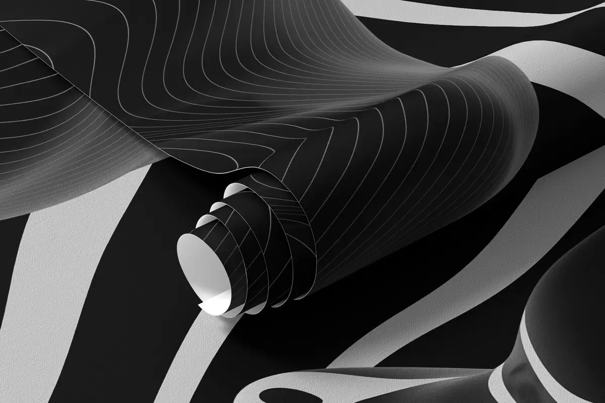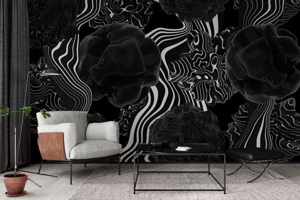 Stenske poslikave abstrakte organske oblike v 3D slogu v črnih tonih z belimi črtami Št. w04628